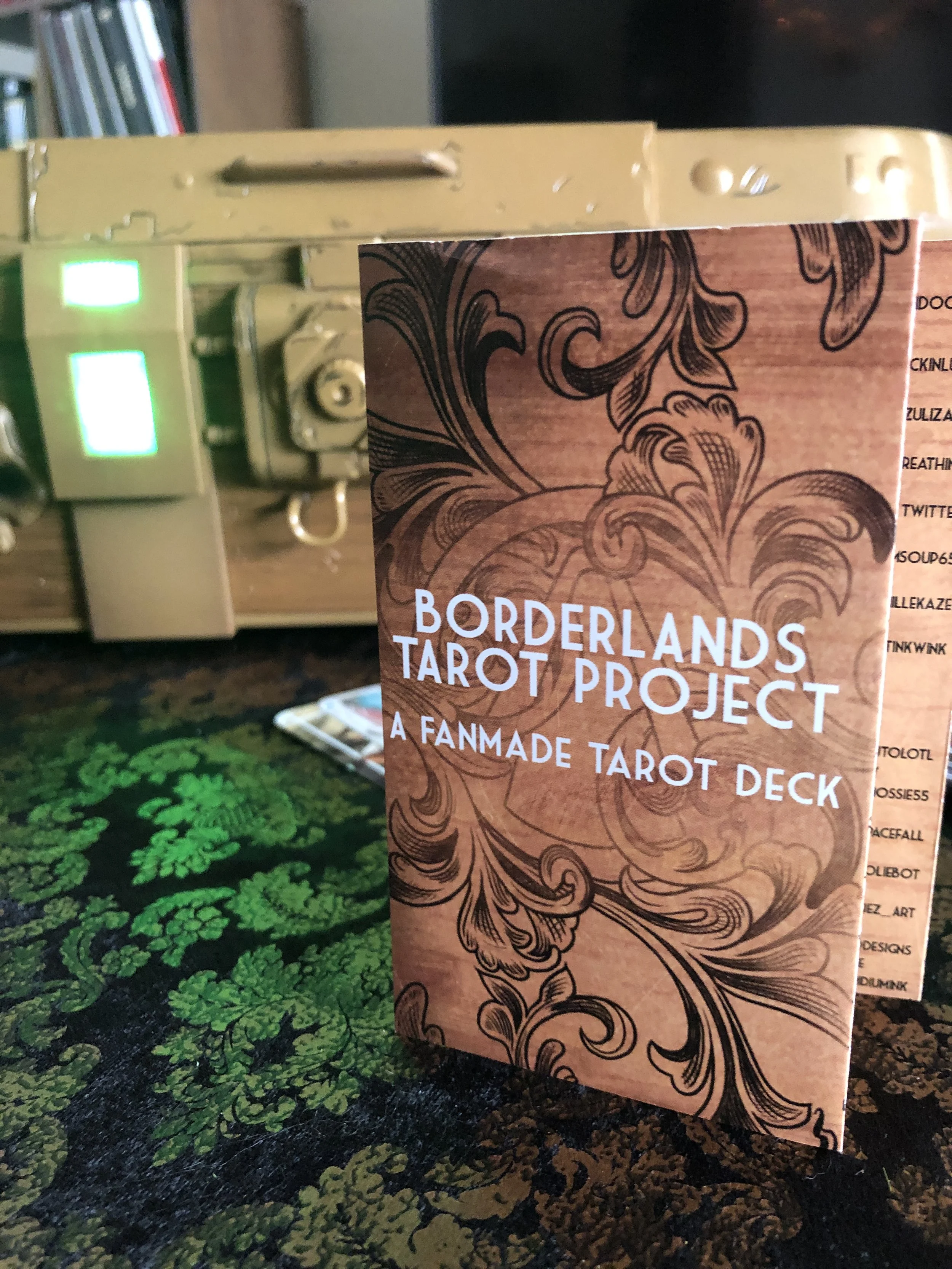 The Borderlands Tarot Project was a fan-run, charity tarot deck, co-hosted and art directed by Camille Alaras. Along with creating two card faces for the deck, duties included curating artists who applied for the project, creating packaging and various design elements for the deck and its distribution.